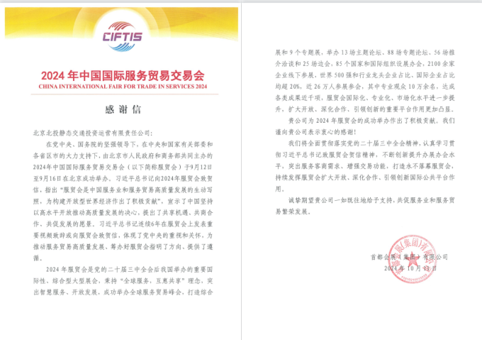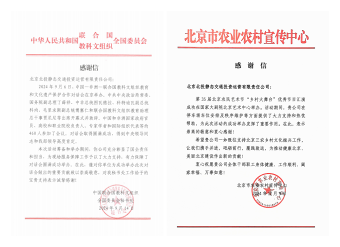 同時,近段時間以來,北投靜態交通公司圓滿完成2024年中國國際服務貿易交易會、中國-非洲-聯合國教科文組織教育和文化遺產保護合作對話會、Sibos年會、第35屆北京農民藝術節“鄉村大舞臺”優秀節目匯演等重要活動停車保障,先后收到中國聯合國教科文組織全國委員會秘書處、中共北京市委金融委員會辦公室、北京市農業農村宣傳中心等單位送來的感謝信,對公司提供的專業停車保障表示感謝。